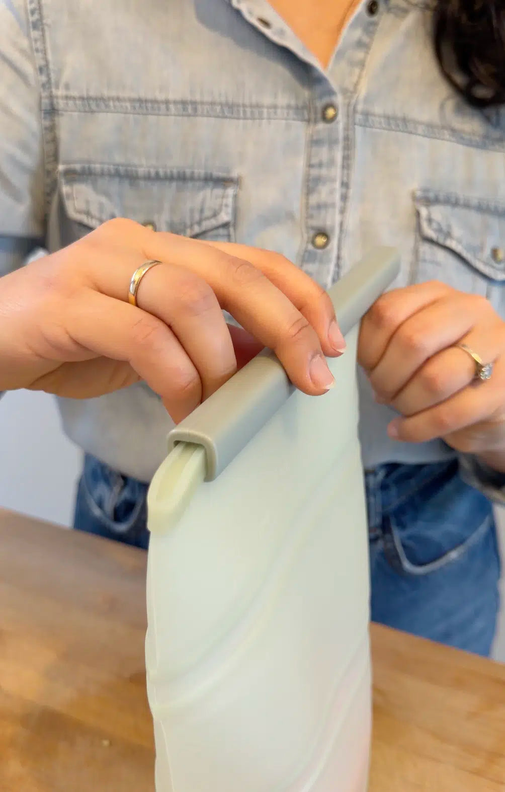 Bij gebruik van de bovenste sluiting is hij volledig lekvrij. Gemaakt van 100% voedselveilig silicone, herbruikbaar en geschikt voor de vaatswasmachine, koelkast, vriezer en microgolf (zonder sluiting). Hij is compact op te brengen.